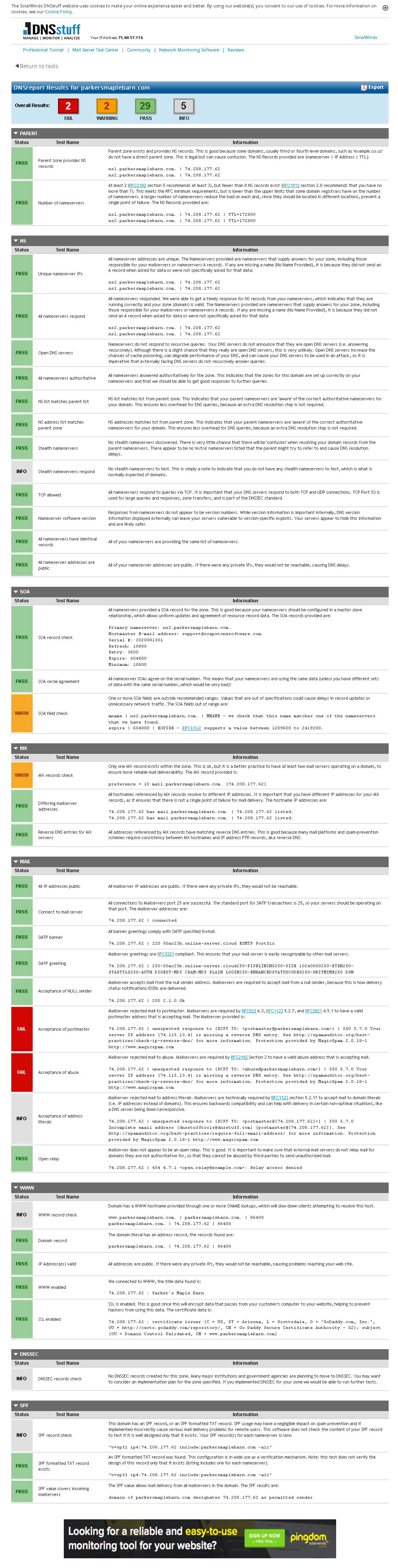 The problem is in the "Mail" section reporting a "Fail" on both acceptance of postmaster and abuse mailboxes. parkersmaplebarn.com mail server has discrete postmaster@parkersmaplebarn.com and abuse@parkersmaplebarn.com mailboxes. We have tested acceptance by sending and receiving mail to/from these mailboxes.